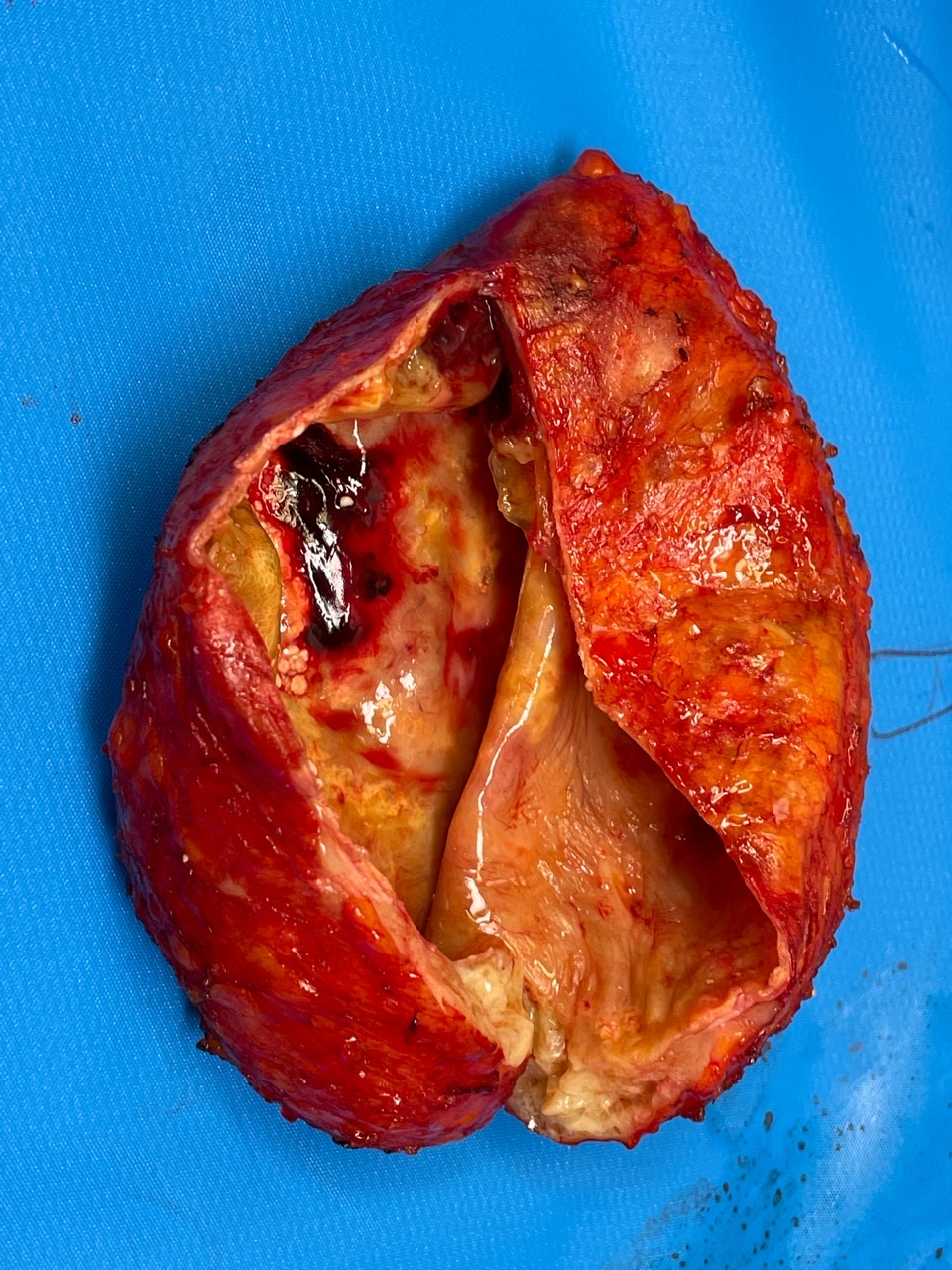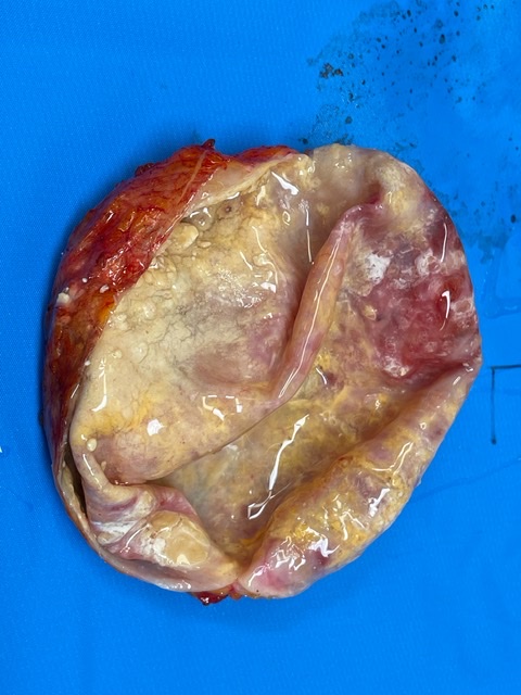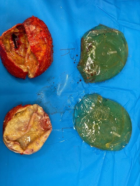 The photos above show 30+ year old gel implants with no MRI or plastic surgeon evaluation. This patient had long-standing capsular contracture (hard scar around implants), silicone leaking into surrounding breast tissue, scar nodules (silicone granuloma), and asymmetry. In the years since her augmentation surgery her breasts had dropped down over the high round implants. She was not aware of any systemic symptoms (BII). Her situation could have been improved years and years earlier. They were carefully removed with the scar intact around the leaking implant ("en-bloc" as some describe it). I opened them after the procedure to evaluate the capsules and implants.